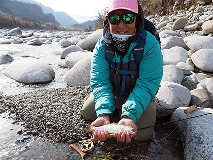 | My guided fishing day with Hisashi was absolutely magical! Mr. Suzuki is a wonderful guide and a wonderful person. In spite of heavy wind conditions, we fished dry flies and met many beautiful rainbow. The very last fish of the day was a beautiful Yamame. Hisashi worked hard to find fish for me, taught me where to find fish (and especially the Yamame) and helped me improve my casting. The river was beautiful, the Forest was lovely and my entire experience was excellent. In addition, I would like to thank you for your timely and patient correspondence in setting up my guided fishing day. You clearly answered all of my questions, and everything happened exactly as planned. I now have wonderful memories of a special day on the water in my ancestral homeland, and unforgettable images of meeting the gem of Japan, Yamame. Please pass my appreciation along to Mr. Suzuki. I will send some photos and I am looking forward to seeing the pictures from Hisashi! I am happy to be a positive reference for Mr. Suzuki and Trout & King. ......Flyfishing in Takayama, Gifu : Pauline from Colorado, USA |