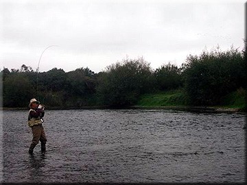 これを使って、ブリッジプールを2流ししたがテークはありません。あきらめて、下流のプールのヘッドをショートキャストで攻めていると3投目にきました。今度は少し大きいらしくなかなか魚が寄ってきません。ギリー達も遠くにいましたので、呼ぶことができません。何度も何度も走られ、相手が弱ってくればひき寄せるを繰り返すうちに、魚が弱ってきました。「bigfish」と叫んでいると、上流300メートルぐらいで釣りをしていたフランス人のバーナードが事態に気づき、近づいてくれて、ハンドランディングしてくれました。メジャーをあててみると、ジャスト80cm、まさに、最終日にメイクドラマとなりました。スペイの神様の贈り物だと思います。午後は釣りをやめグランタウンオンスペイにある、モーティマーズという釣具店に一人で観光に行きました。こうして、僕のスペイ川釣行は終わりました。