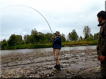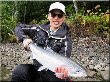 前半の2日間は厳しい釣りを強いられた。キングの群れにフライを投げ入れるのだが、食ってくれない。その代わりに、全く期待していなかったスティールヘッドが3尾という、うれしい誤算。後半の2日間は、遡上してきたばかりのフレッシュなサーモンが大量に群れている場所に案内される。ヒットは多いが、川を縦横無尽に走られ振り回された挙げ句、水中の倒木にからまってプツン、というのがお決まりのパターン。バッキングラインまで引き出す強烈なパワーは十分に堪能したものの、取り込めたのは数尾だった。
