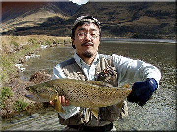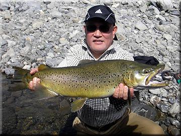 10年に一度のマウス・イアーだという、ガイドの言葉に誘われて南島の山岳渓流に行きました。水際に生息する5センチくらいのマウスが大量発生し、それを食べたトラウトが巨大に成長するという。そのことは釣れたブラウンがすべて64センチ以上ということでも実証されました。特に70センチのブラウンはその長さよりも13ポンドという重さに驚きました。ニコパチをしようにも、重すぎて持ち上げることが出来ないと初めて思いました。マウスが5匹は入っているねとガイドに言ったら、それ以上だよと言っていました。この川の上流は平野になっていて、2月はあんまり良くないとガイドも言っていましたが65センチ8ポンドを筆頭に5匹のブラインが釣れました。ガイドも3年魚にしては大きく成長していると言っていました。脅威のマウス・イアーでした。ちなみに山岳部で一匹だけニジマスが釣れましたが4年前に同じ場所で日本人のMさんという女性が釣ったので同じ魚だと思うと言っていました。 |