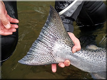 私も自己記録更新のブラウントラウト(66cm・11ポンド)をニンフでキャッチすることができましたが、十分に喜びに浸る間もなく、その2時間半後に、妻は74cm・14ポンドというモンスターをドライフライで釣ってしまいました。いずれも鼻先が曲がった精悍な顔立ちと、大きく盛り上がった背の厚みが印象的で、圧倒的な存在感を漂わせていました。