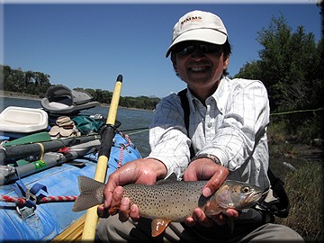 4日目はイエローストーン・リバーでホッパーを流します。当りは各好ポイントで結構あるのですが魚がすごい敏捷なのと私の反応の遅さかなかなか合わせがあいません。ロバートのお陰で何とかブラウンを釣り、和田君はレインボーなどを釣り満足の納竿でした。後は釣りばかりではなくフライショップで地元のSimmsのフィッシング・ウエアーが豊富×円高で興奮状態で上から下まで買ったり、ボーズマンのレストランで地元のビールや食事を楽しんだり、イエローストーン国立公園で1日フルに観光したり、と大満足のモンタナフィッシングでした。面積は広く、人口少なく、天気も良く、人も親切ですよ。まさに州の標語通り”Big