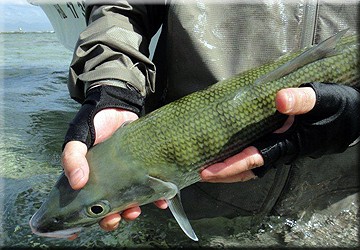 まず、魚がとてもスプーキーということで以外と繊細なタックルでした。#8ラインにリーダーは10ポンド、フックも#6〜#4でテイリングしている魚には#10も使うとか。ガイドはこのタックルで13ポンドのボーンをキャッチするそうです。当日はかなりの強風と時折の雨で魚の警戒心は少ないとのことでしたが、その分キャストが難しく、ライントラブルも多かったです。写真のようにレインウエアを着ての釣りでした。このコンディションの中でキャッチできたのは本当に幸運だったと思います。ハワイのボーンはグリーンの背がとても印象的でした。いろいろプラクティクスできたので次回はもっと充実した釣りができると思います。楽しみです。 |