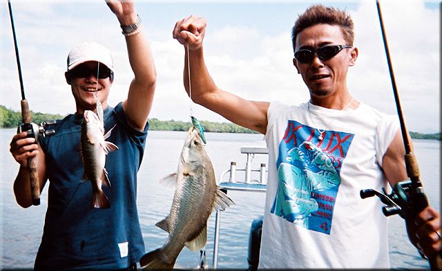 ガイドテリーの朝の第一声がtoday is tough 釣れないごめんなさい、でも no fishは嫌い、がんばりましょーでした。ジョンソンリバーという所の河口付近で1日釣をしました。結果から言うと、バラマンディはテリーが2匹、僕が1匹でした。他にマングローブジャック、マゴチ、トレバリーが多数釣れ、思ったより引きが強く楽しかったです。正直オフシーズンという事で、バラマンディーはあきらめ気味だったのですが、最初にテリーが釣って見せてくれたのでやる気がでて、結果釣ることが出来ました。サイズは45cmぐらいで、ヒットルアーはメガバス・ワンテン・オイカワカラーです。そうそう、テリーにヒゲがなかったので違うテリーかと思ったら、ヒゲが赤、白、茶色、黒とまだらになったから剃ったって言ってました。ちなみにシマノのビデオを昨夜見たらしく、トリプルインパクトにものすごく興味を持っていたのであげました。ビックベイトはクレイジーとしか言われませんでした(投げたかった)。今度はベストシーズンに来いといわれ、本当にまた行きたいと思いますその時はまたテリーにガイドをお願いしたいです。青木さん、テリー、楽しいひと時をありがとうございました。 |