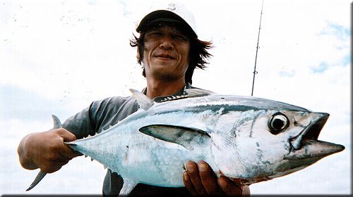 当日は私達にとって3回目のGTフィッシングでしたが、午前中早々と主人にヒット!しかもかなりの手応え!!これは幸先が良いかも?と思ったやさき、残念ながら根に走られラインブレイク・・・キャプテンいわく「30キロはあった」との事) ←竿がしなっている写真がこの時です。ランチ後グレートリーフへ移動し(途中イルカに遭遇!!)2回目のヒットとなりました。わりと深いところでのヒットだったせいか、根に走られることもなく、10分位のファイトで捕れたと思います。GTとしては大きい方ではないと思いますが主人にとっては3匹目の自己最大のGTをゲットする事が出来大変満足のフィッシングとなりました。何よりも、それまで寡黙(と言うかシャイ)なキャプテンのお父様がすごーく喜んで下さったのが印象に残っています。3回のGTフィッシングで1匹づつゲットしている主人は運が良いのかも知れません。妻の私も負けずにキャスティングを繰返しましたが、今回も(!!)ノーフィッシュでした・・・また、機会がありましたら是非釣りの手配をお願いさせて頂きたいと思います。本当に楽しい釣りをありがとうございました。 |
