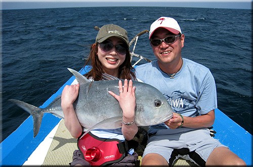当初1日の釣行予定のはずが、バイトは多数あるものの、満足できるサイズではなく、急遽数時間チャーターし、初めてGTと呼べるサイズに巡り会うことができました。準備運動もしないで、いきなり150g前後のルアーをフルキャストしたせいで肩が外れそうになるハプニングもありましたが、GTのコンディション、ファイト、風格・・・どれをとっても非常に素晴らしく、とても感動しました。妻もライトタックルで10kg程度のGTとファイトし、魚の強さにびびっていました。(笑)今回このような最高のステージを用意していただいた御社ご担当者様、とても親切な現地スタッフ、強面のキャプテン並びに優しいクルーの方々にこの場を借りて御礼申し上げます。どうもありがとうございました。感謝しております。 |
