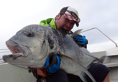 田丸さんのマグロで活気立つ船内!!自分はマグロの血の臭いでグロッキーになるものの、ストイックに竿を振る大野さんと多田さん。船長が風裏に船をまわしてくれ、凪いだ場所で船の穂先を譲ってもらい、岬の払い出しにキャストすると・・・出た〜!!ボシュっと水柱が上がった直後に強烈な引き!!間違いなくGTの強烈な引き!!周りにハヤされ、何回か強烈なツッコミに耐えながら何とか水面まであげてくると、デカイ!!船長に軽量してもらうと33kgのGTでした!モルディブの雪辱が果たせて、初GTがまさか30kgオーバーとは出来過ぎです!!古澤さんがシャンパンを用意してくれていて、こんなに美味しいシャンパンは初めて!!
