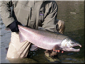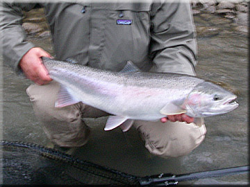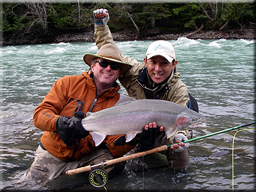 1mにはちょっと足らないが堂々とした、スキーナ・スティールヘッド。このお客様は3日連続スティールヘッドをキャッチ。昨年のノーフィッシュがうその様。いやいや、昨年の悔しい思いを引きずりながら過ごした1年の成果ですね。 |