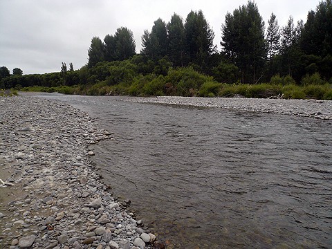 先ずはクライストチャーチ空港からすぐ近くの本流に入った。河原が開けていて非常に釣りやすい川だ。ポイントは流芯手前の駆け上がりか、対岸のブッシュ下の深みか。 |