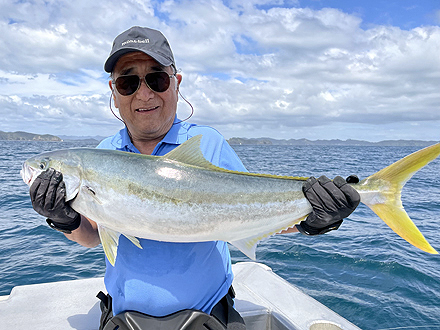 82歳での一人旅でしたが、ベイ・オブ・アイランズのポイントを知り尽くしたベテランキャプテンと、事務を担当する奥さんのお二人が実に親切にガイドしてくれました。そのおかげで、これまで訪れたアラスカ、カナダ、モンタナ、カムチャツカ、メキシコ、パタゴニアのどこよりも満足できる釣行となりました。初日はヒラマサ14尾、鯛16尾を釣り上げ、さらにヒラマサ5尾を掛けましたが、取り込みの途中でサメの餌食になってしまいました。 |