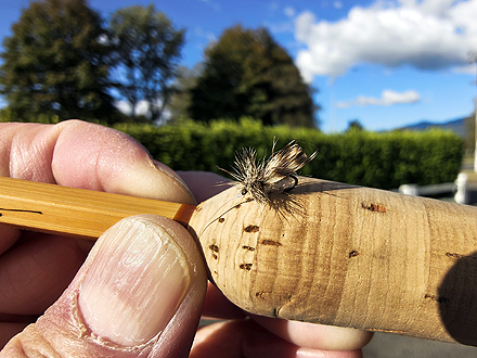 フライ初心者なのでフライパターンや種類はガイドさん任せでした。初日はドライフライメインでしたけど4日間通じてドライ&ニンフのダブルフライで大きめのフライを目印替わりにしてました。大物はその目印フライに食ってくる傾向がありました。ロングキャストよりキャストの正確性が求められる釣りでした。 |